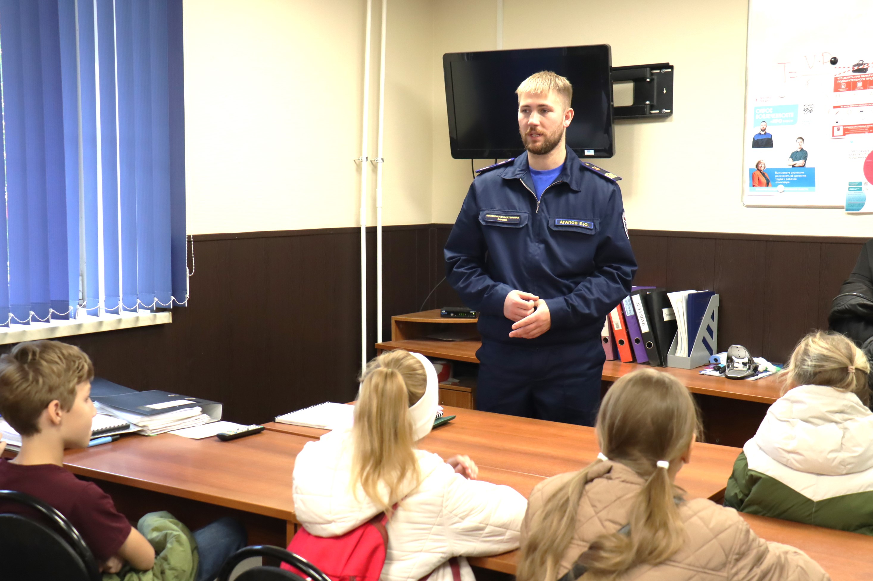 Ребята увидели небольшой фильм о работе спасателей Московской городской поисково-спасательной службы на водных объектах, а после его окончания бойко отвечали на вопросы Егора Юрьевича на тему безопасного поведения у водоема.