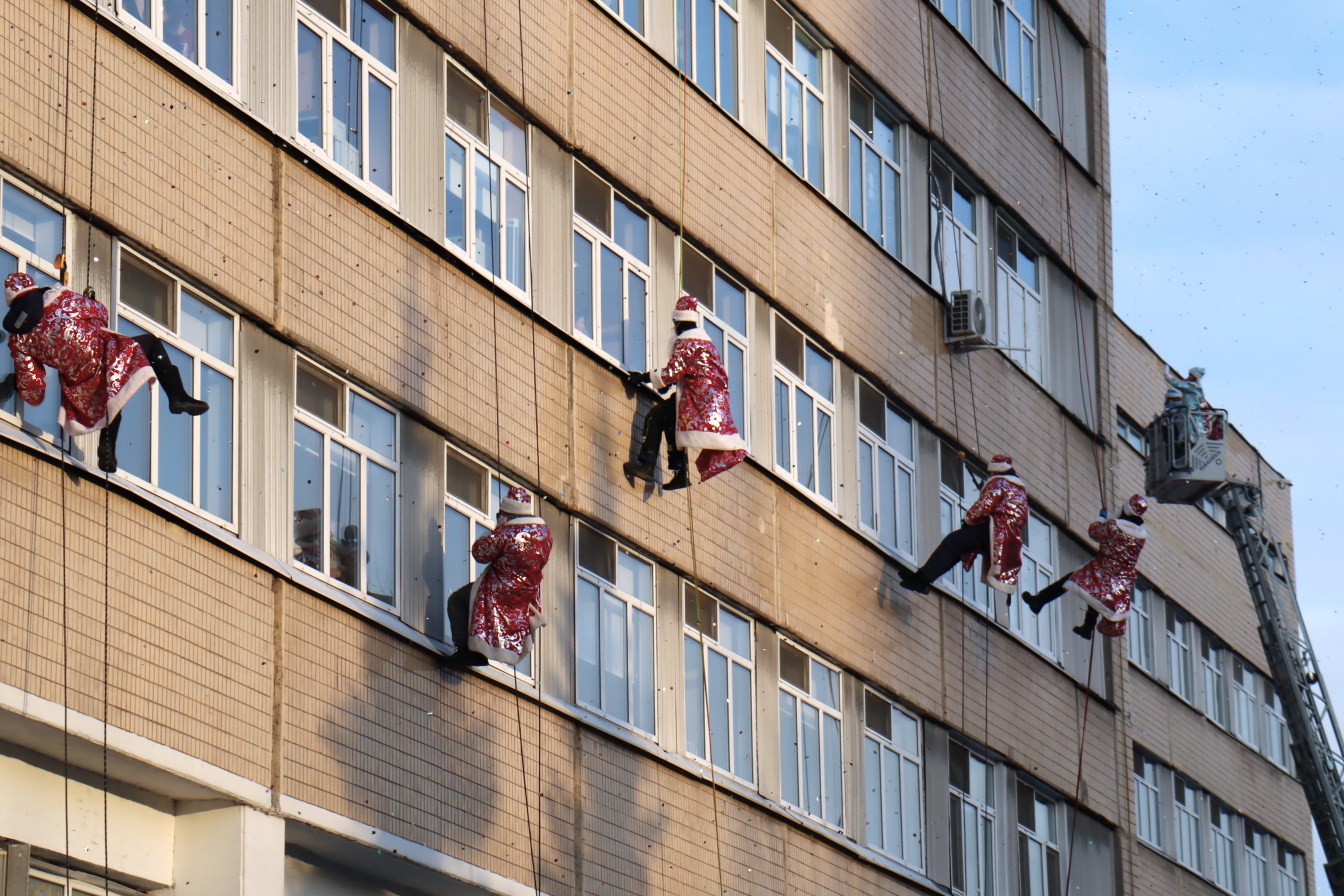 Работники Пожарно-спасательного центра, спасатели и психологи, облачились в костюмы сказочных героев – Дедов Морозов и Снегурочек, затем разделились на две команды. В первой состояли Деды Морозы-спасатели, которые проявив высокий профессионализм и мастерски продемонстрировав альпинистскую подготовку, спускались с крыши больничного корпуса, аккуратно стучались в окна палат, приветствовали малышей, запускали хлопушки. На земле, под окнами палат, активно поддерживали, находящихся в воздухе коллег-спасателей Снегурочки. Работницы отдела психологического обеспечения весело махали руками маленьким пациентам стационара. Детей из другого больничного корпуса поддерживала вторая команда, состоящая из Деда Мороза-спасателя и Снегурочки – психолога, которая поднималась к окнам маленьких пациентов с помощью автолестницы.